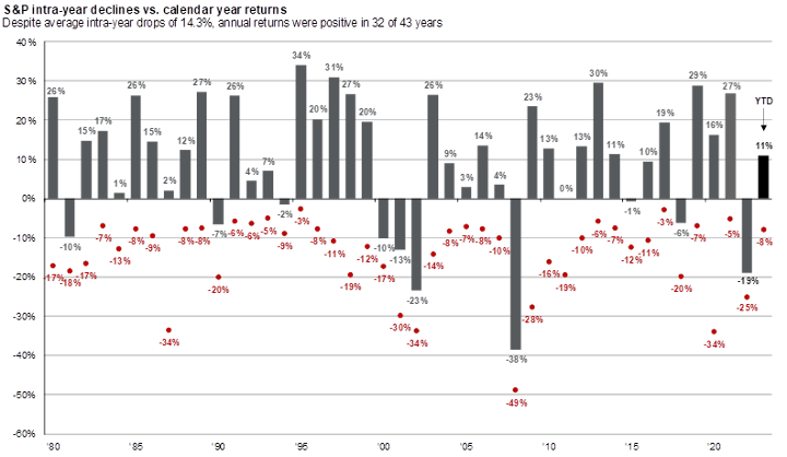 Exhibit A: S&P 500 intra-year declines versus calendar year returns