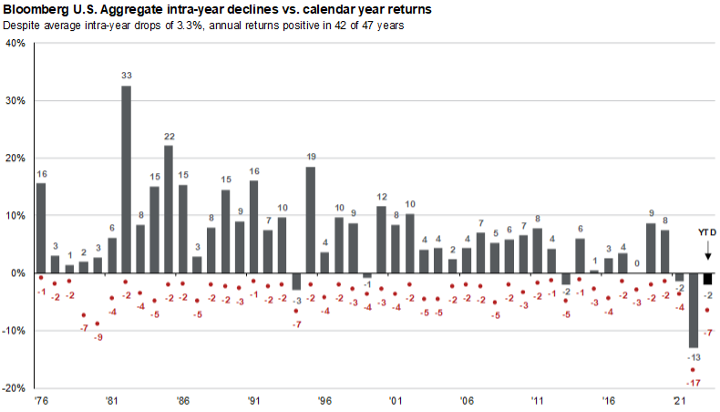 Returns are based on total return. Intra-year drops refers to the largest market drops from a peak to a trough during the year. For illustrative purposes only. Returns shown are calendar year returns from 1976 to 2022, over which time period the average annual return was 6.6%. Returns from 1976 to 1989 are calculated on a monthly basis; daily data are used afterward. Guide to the Markets – U.S. Data are as of September 30, 2023.