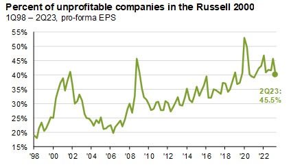 Finally, today’s higher rates arguably create a healthier market ecosystem for all investors since higher rates tend to enforce greater financial discipline on corporate managers (higher rates means higher break-evens for pet projects, acquisitions, etc.). Gone are the days when free or cheap money rendered asset prices meaningless (when money is free, price doesn’t matter), which ultimately led to an explosion in unprofitable companies and likely fueled the exorbitant valuations and anomalous returns of many growth companies over the past 10 to15 years (Exhibit C). Those days are hopefully now behind us, and, in our view, that would be a good thing for all investors, regardless of risk tolerance or investment objective.